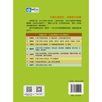 2、职场生存智慧。职场人要成功不仅仅要拼执行力,更要拼表现力。大多数人在工作中选择了做默默无闻的“老黄牛”,不懂得自我表现之道,尤其是不懂汇报工作这门技术活。本书将工作汇报的职场智慧化为可以操作的实用工具,有案例,有方法,有步骤,有要点,八大汇报技巧,干货十足,读者可现学现用,掌握汇报技巧才是正经事。