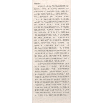 《伯明翰学派前期媒介研究(1964-1979)》从五个方面论述了伯明翰学派前期媒介研究(1964-1979)。一是对中心早期即1971年中心媒介小组成立之前媒介研究的回顾。这段时期中心对媒介的研究广泛而深入,主要包括对BBc、ITv、广播的商业化、报纸、《图片邮报》等进行了研究。第二是政治与意识形态研究。中心的创始人以及对中心产生过重要影响的文化理论家大都来自工人阶级家庭,他们对于工业关系、大选以及国家政策有着天然的敏感和深切的关注。其中包括新闻图片的决定性、媒介对罢工的报道以及对时事新闻节目的分析等。第三是受众研究。自霍尔发表《电视话语的编码与解码》以来,中心陆续发表戴维·莫利的《重新概念化“受众”》等理论性文章以及对“编码/解码”理论的实践研究。第四是监控危机。从1972年开始,中心对“行凶抢劫”“道德恐慌”做了一系列的研究,发表了一些论文,并最终于1976年出版了《监控危机》一书。《伯明翰学派前期媒介研究(1964-1979)》对资本主义媒介的生产机制做了深入而细致的分析。第五是女性媒介研究。中心的女性研究者们针对大众媒介中的妇女形象、女性气质意识形态、家庭妇女与大众媒介等课题做了一些探索性的研究。这些方面即形成了中心极具特色的“女性媒介研究”。