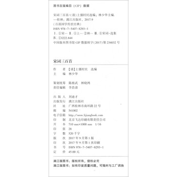 《宋词三百首(典藏版)/百部国学传世经典》汇集了唐诗经典之作,集中地反映了唐诗艺术成就的无穷魅力。用深情幽妙﹑风格多样的美妙文字展现出一幅多彩的历史画卷。诗情画意,让人尽情体味唐诗意境;唯美笔触,令人寄托无限美好情思。