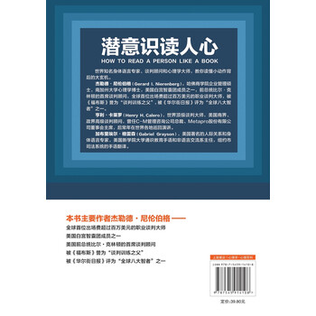 ★世界知名心理学大师杰勒德·尼伦伯格、谈判顾问加布里埃尔·格雷森和身体语言专家加布里埃尔·格雷森3位世界级高手的“读心秘籍”。