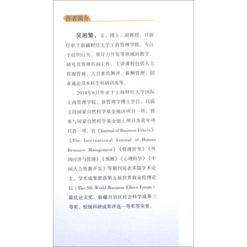 2014年6月毕业于上海财经大学国际工商管理学院,获管理学博士学位。目前主持国家自然科学基金地区项目一项,曾参与国家自然科学基金面上项目及青年项目各一项。在《Journal of Business Ethics》《The International Journal of Human Resource Management》《管理世界》《外国经济与管理》《预测》《心理科学》《中国人力资源开发》等期刊发表多篇学术论文。学术成果曾获第五届世界商业伦理论坛(The 5th World Business Ethics Forum)、新疆自治区社会科学成果三等奖、校级科研成果评选一等奖等荣誉。