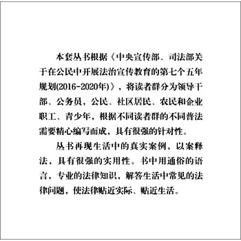本套“七五”普法教材系列丛书根据《中央宣传部、司法部关于在公民中开展法治宣传教育的第七个五年规划(2016-2020年)》,将读者群分为领导干部、公务员,公民、社区居民、农民和企业职工、青少年,根据不同读者群的不同法律需要精心编写而成。