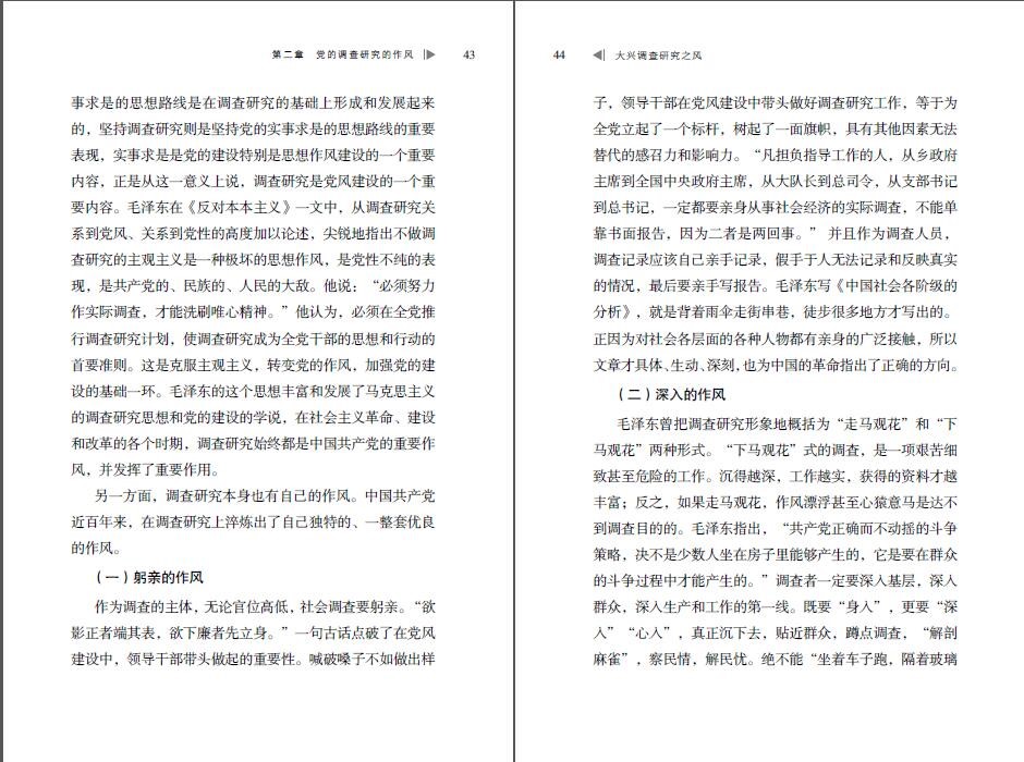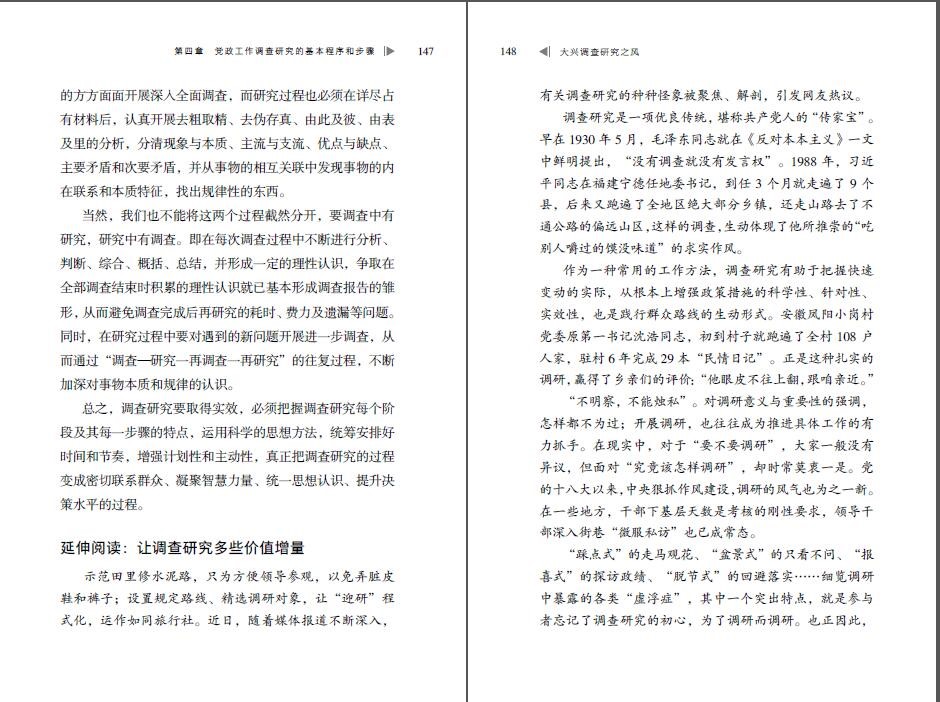 全书 ,从调查研究是我党的优良传统、党的调查研究的作风、党政工作调查研究的基本理论和方法、党政工作调查研究的基本程序和步骤、党政调查研究的应用推广与成效评估、建立党政调查研究工作的长效机制,全方位的介绍习近平总书记关于调查研究的重要论述,讲述中央政治局关于八项规定的实施细则中关于调查研究作风的论述,为领导干部按照习近平总书记和中央的要求做好调查研究工作提供指导和基本借鉴。