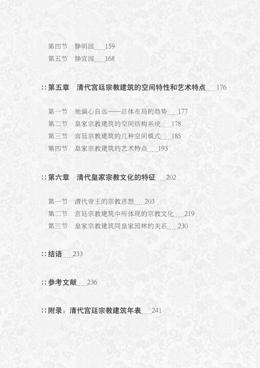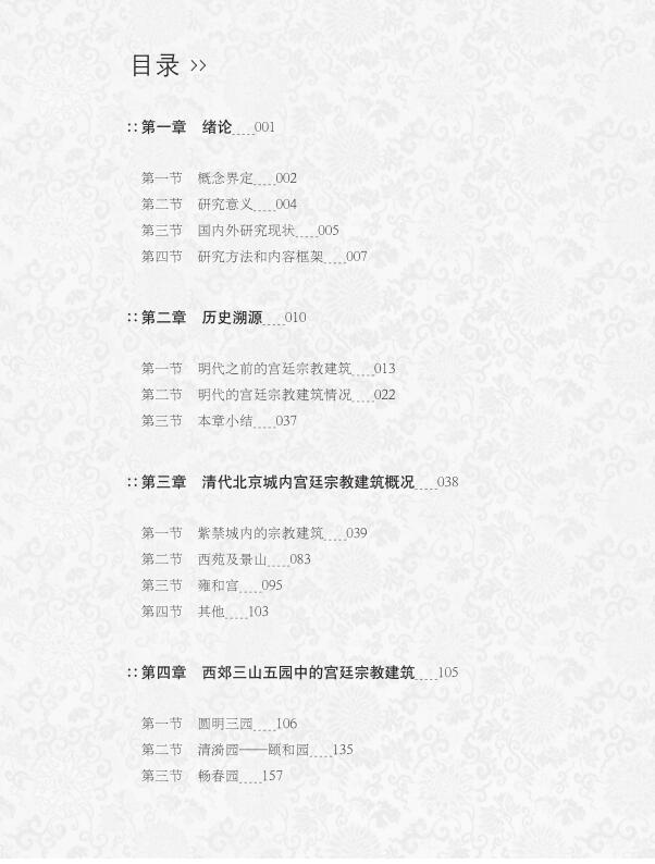 本书包括三个部分:首先是历史溯源,提供一个总体宗教发展的背景和宫廷宗教建筑的演变情况,主要着眼于宗教史研究成果的介绍,为正文的展开做了铺垫。其次是清代宫廷宗教建筑具体而微的个体介绍,着重回答与文化相关的几个问题,即为什么建、如何建、如何使用、历史演变等情况。这部分主要反映本书研究基础工作的成果,包括具体的考证和推断。这一部分的展开在大的方面以空间位置为线索,从*核心的紫禁城逐渐向外扩散,直至西郊离宫御园中的宗教建筑。在一定的地理位置内部,一般以宗教属性作为细目展开,这样便于进一步在宗教文化方面进行讨论。第三部分就是在充分占有第二部分资料考证的基础上进行综合分析,重点在于循着建筑特有的线索解读文化现象,因此不乏建筑上具体特色的探讨,如空间关系、建筑尺度、艺术特点等,以建筑印证历史、文化。同时将考察的范围略为放大到建筑的管理系统和不同帝王个人的宗教态度等方面的研究上,以期有一个全面的认识。这一部分是本书的核心内容,结论在论述中自然产生。全书试图通过宫廷宗教建筑所涉及的多个方面来研究、探寻清代宫廷宗教文化的本来面目。