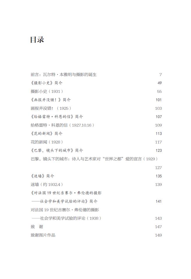 本书中记录的都是本雅明对摄影的诸多重要论点与看法,是一本对本雅明1931年起就摄影历史写作的作品新译本,还增补了大量其他写作作品,包括已经出版和未来得及出版的作品,其中一些作品在此是首次被翻译称英文。从1925年到1938年,本雅明讨论了摄影的许多层面,从畅销杂志刊载照片,卡尔?布鲁菲尔德特的摄影工作室,引人入胜的印照明信片,谈到巴黎与摄影相片之间的独特关系。本书附有专有词汇表和语境介绍,能够帮助读者了解与摄影的多方重要意义。