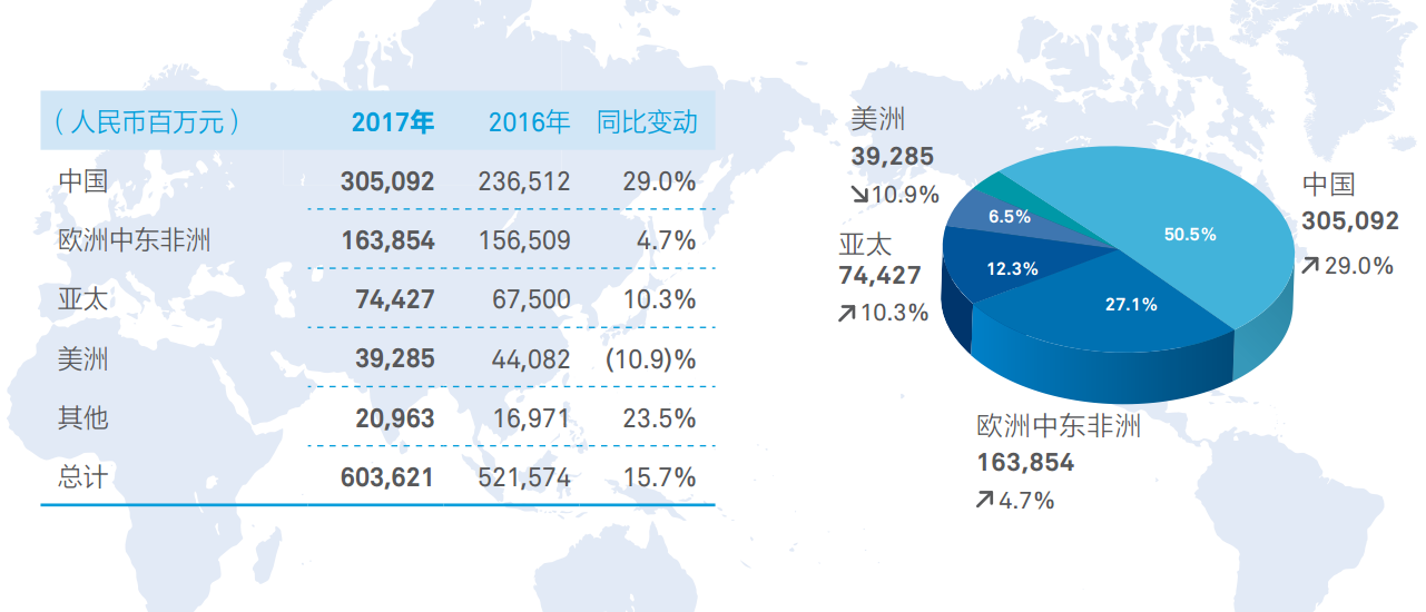 中国市场受益于运营商4G网络建设、智能手机持续增长以及企业行业解决方案能力的增强,实现销售收入人民币305,092百万元,同比增长29.0%;