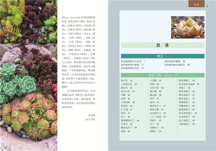 本书共分40部分。第一部分概述,分别介绍多肉植物概念与术语、养护基础、养护月历、繁殖和病虫害防治等多肉植物栽培要领;第2~40部分分别介绍龙舌兰科、番杏科、景天科、芦荟科、仙人掌科等39科1200多种多肉植物。各科和较大的属都简要地介绍该科(属)多肉植物概况和共性的内容;各种多肉植物都有其学名、别名、分类地位和识别要点介绍。书中采用1800多张彩色照片,直观地体现了各种多肉植物的形态特征;对相似的品种还简要地介绍区别要点。