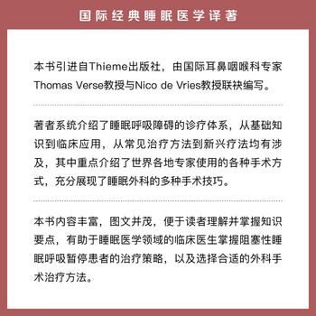 本书引进自 Thieme 出版社,由国际耳鼻咽喉科专家 Thomas Verse 教授与 Nico de Vries 教授联袂编写。著者系统介绍了睡眠呼吸暂停的基本理论与治疗方法,特别是阻塞性睡眠呼吸暂停的基本知识和目前常用的睡眠外科手术方法,充分展现了睡眠外科的多种手术技巧。本书内容丰富,图文并茂,便于读者理解并掌握知识要点,有助于睡眠医学领域的临床医生掌握阻塞性睡眠呼吸暂停患者的治疗策略,以及选择合适的外科手术治疗方法。