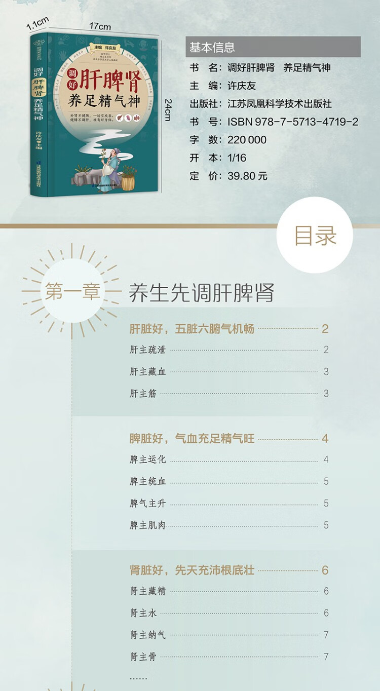 调理肝脾肾,对于防治慢性病、养护其他脏腑和保障身体健康有重要意义。本书选取了生活中常见的22种脏腑病证,通过典型症状帮助读者识别肝脾肾的问题。针对不同的病证有多样的调理方法,比如经典方剂、按摩穴位、养生食疗等。另外,书中还介绍了容易忽视的生活习惯和保养妙招,让读者通过这本书可以做到远离慢性病,气血充足身体好。