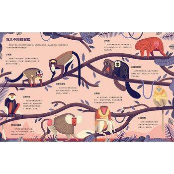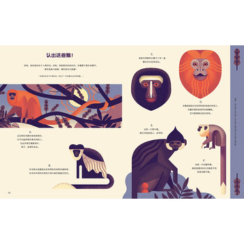 如今,戴维采用风格独特的几何画风与海报艺术理念,全新创作《了不起的猴子》,为像他一样喜爱猴子的“猴粉”们送上一份难得的礼物。在这本赋予了戴维浓厚热情的的猴绘本中,他用简明生动的几何线条和古典风格的朴实色彩,完美地呈现出尾巴粗壮的卷尾猴、毛色鲜明的疣猴、圆头圆脸的松鼠猴、面部突出的山魈等44种长相各异的猴子,以及枝叶缠绕的丛林环境。浏览书页的同时,读者仿佛置身于野外的猴子动物园。