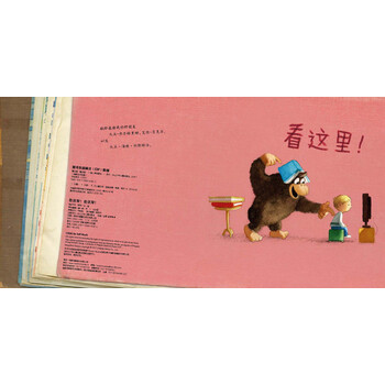 这是一本特别的书,全书仅仅只用了“看这里”、“当心”、“出去”“看完了”四个词在讲述故事,但却表达了兴奋、惊奇、生气、担心和欢喜等一系列感情。故事讲述了一头大猩猩被一本有趣的书所吸引,想让它的小伙伴——一个小男孩也来看这本书,但无论大猩猩说了多少次“看这里”,小男孩还是于沉迷电视机。后来,大猩猩不小心破坏了电视机,小男孩生气地大叫道“出去”。不过没了电视的小男孩,却捡起书高兴地读了起来。这是一个简单的故事,却能在带给读者快乐的同时,引起大家的反思。