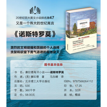 《诺斯特罗莫》中虚构了一个南美国家,长期处于暴政和革命当中。在漫长的开篇,错综复杂的局势变化和随时改旗易帜的暴动革命,但是事实上,所有的动荡都围绕着那一座稳固的基石——查尔斯?古尔德的银矿。银矿的矿长已经成为了物质的化身,所有的维系的感情都脆弱不堪,老年的意大利党人只有回忆加里波第的荣光,只有那个号称永远不会被腐蚀的工长诺斯特罗莫挺身而出。但是财富让人胆怯,爱情让人盲目,最终的一声枪响,宣告了个人英雄主义的死亡。也许,这部略显冗长的小说,最后又回到了起初的那个寓言里面,被财富所束缚的灵魂,只能在山和海湾之间号哭,这种幽魂也不会散去。