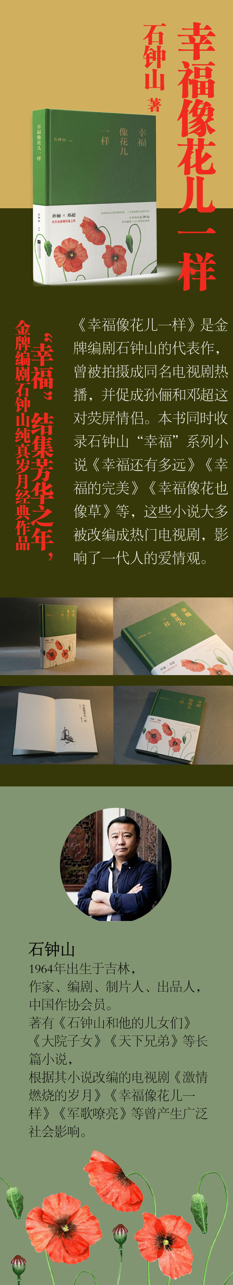 《幸福像花儿一样》是金牌编剧石钟山的代表作,曾被拍摄成同名电视剧热播,并促成孙俪和邓超这对荧屏情侣。本书同时收录石钟山“幸福”系列小说《幸福还有多远》《幸福的完美》《幸福像花也像草》等,这些小说大多被改编成热门电视剧,影响了一代人的爱情观。