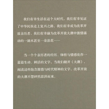 当一个个亲历者的经历、体悟与情感化作一篇篇生动、鲜活的文字,当我们翻开《大潮》,阅读这些饱含激情与时代精神的文字,改革开放的大潮不禁砰然澎湃而来。