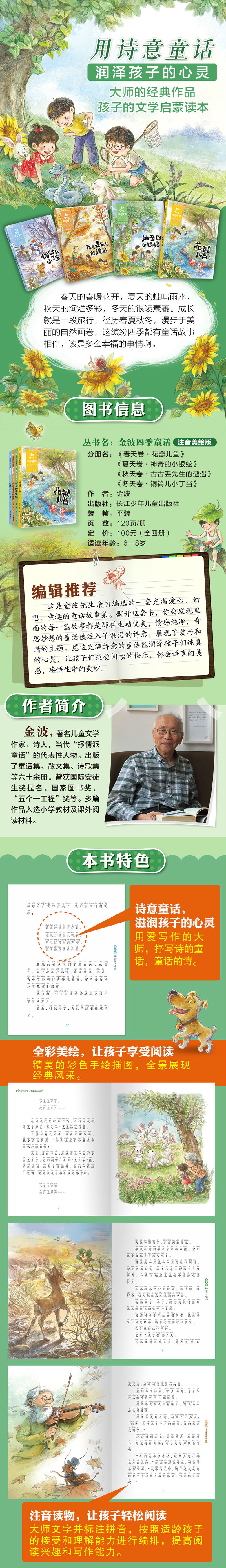 《铜铃儿小丁当》:本书是《金波四季童话》系列之一。这些童话故事以冬季广大的自然界为背景,以自然界中活跃的生灵为主人公,以它们之间的生活故事展开,想象力丰富、情感纯净,再加上诗意的叙述语言,展现了爱与和谐的主题。本册收录了《与人共舞》《铜铃儿小丁当》《影子人》《雪人》等金波的代表作品。