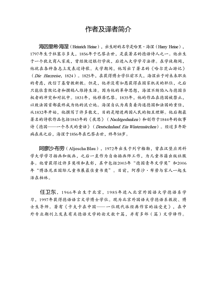这些诗歌在德国几乎是家喻户晓,滋养过数代德国人的精神、思想和心灵。对中国孩子们来说,这些诗歌无疑也能起到启迪智慧、陶冶情操、提高语言与审美能力的积极作用。诗中人物表现出的信任、忠诚、守信、慷慨、勇敢、执着、博爱、自尊、责任心等优良品德能对孩子们的人格养成产生潜移默化的积极作用;诗中关于人生、命运、死亡、正义、尊严、友谊的思考也为孩子们提供了洞察人生的智慧。