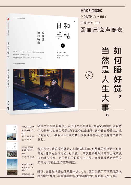 《日和手帖004:跟自己说声晚安》是「日和手帖」生活品牌的第4本纸质出版物。以「助眠」为主题,全方位探讨影响睡眠的诸多因素、如何安放情绪,进入深度睡眠。