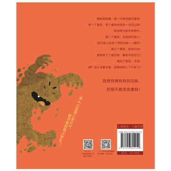 暑假真刺激,每一天都有新的冒险!第1个冒险:挖个通向地球另一边的山洞!我有得力助手来帮忙;第二个冒险:变身泥巴超人!泥巴超人还有个特异功能——隐形!第三个冒险:捉妖行动!家里来了个贪吃怪,看我不抓住它!第四个冒险:寻宝!咦?怎么寻着寻着,我爬到树上下不来了?我想有拥有特异功能,把每天都变成暑假!