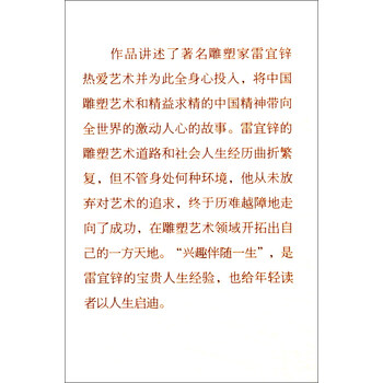 著名雕塑家雷宜锌热爱艺术并为此全身心投入,将中国雕塑艺术和精益求精的中国精神带向全世界的激动人心的故事。雷宜锌的雕塑艺术道路和社会人生经历曲折繁复,但不管身处何种环境,他从未放弃对艺术的追求,终于历难越障地走向了成功,在雕塑艺术领域开拓出自己的一方天地。“兴趣伴随一生”,是雷宜锌的宝贵人生经验,也给年轻读者以人生启迪。