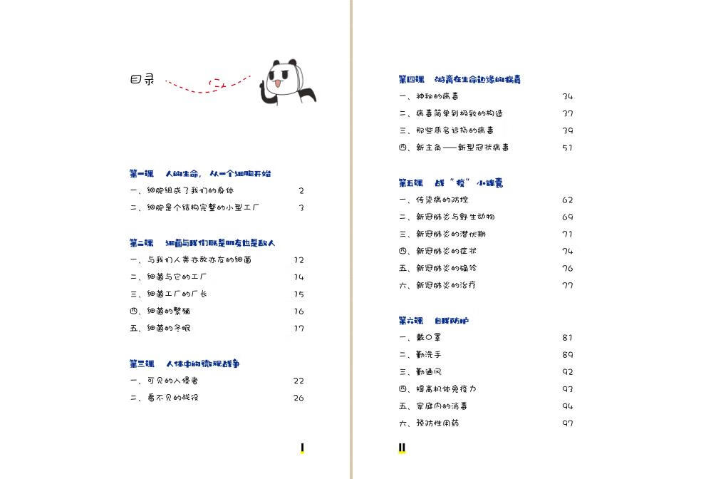 细菌、细菌的结构、繁殖方式、细菌与人的关系;人体免疫系统的各种细胞怎样抵御致病源的入侵;病毒的发现者、病毒的结构、世界上恶名远扬的病毒和新型冠状病毒;传染病与野生动物、新型冠状病毒的传播方式、潜伏期、症状、确诊、治疗;应对新型冠状病毒的防护知识,戴口罩、勤洗手、勤通风、提高免疫力、家庭消毒和预防用药。