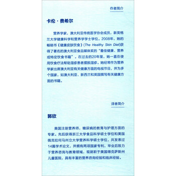 [澳]卡伦·费希尔,营养学家,澳大利亚传统医学协会成员,新英格兰大学健康科学和营养学学士学位。2008年,她的畅销书《健康皮肤饮食》(The Healthy Skin Diet)获得了著名的澳大利亚食品媒体奖的“健康、营养或特定饮食书籍”。在过去的20年里,她一直在使用饮食疗法帮助湿疹患者摆脱湿疹。她经常作为营养学家出席澳大利亚有关健康方面的电视节目,并为多个国家,如澳大利亚、新西兰和英国撰写有关健康方面的书籍。
