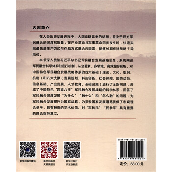 《大道荣光:军民融合论》深入贯彻****军民融合发展战略思想,系统阐述军民融合科学体系和运行机制,从全要素、多领域、高效益的视角,对中国特色军民融合发展战略体系的四大基础(理论、文化、组织、机制)和八大支撑(发展规划、科技创新、社会保障、国防动员、信息基础、产业发展、人才教育、基础设施)进行了全新构建,形成了中国特色“四梁八柱”军民融合发展战略的科学体系,回答了军民融合深度发展“为什么”“融什么”和“怎么融”的问题,为军民融合发展提升为国家战略,为探索国家发展道路提供了宏观理论参考,具有较高的学术价值。对“军转民”“民参军”具有重要的理论指导意义。
