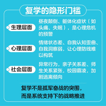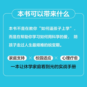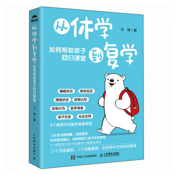 本书从 8 个维度进行科学评估,告诉家长,孩子是否具备复学的条件,复学后需要注意什么。本书包含两部分,第一部分聚焦孩子复学的问题,深入剖析孩子复学面临的种种问题,如生理层面的昼夜颠倒、躯体反应、异常行为,心理层面的情绪障碍、认知困境,社会层面的家庭关系、校园关系断裂等,有针对性地打造全方位的支持系统,为孩子顺利复学提供助力。第二部分探讨孩子社会功能修复问题,深入剖析孩子社会功能受损的各种情况及其成因,为社会联结重建、创伤疗愈、亲子关系修复提供科学有效的方法和策略,助力孩子重拾自信,顺利回归社会。书中的案例均来自真是的心理咨询,可以为家长示范如何与孩子沟通。