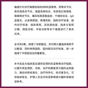 编者针对诊疗难度较高的 8 种风湿骨病,即骨关节炎、类风湿性关节炎、强直性脊柱炎、系统性红斑狼疮、银屑病关节炎、痛风和高尿酸血症、干燥综合征、IgA 血管炎,从发病原因、病理机制、国际诊疗标准、国内诊疗标准、临床表现、实验室检查、临床分型和分期、西医诊断、中医诊断等多个维度进行了具体论述。全书共 9 章,梳理了诊断路径,并对照大量临床病例予以解读,同时参照国际、国内前沿诊疗标准,进一步强调了中西医结合的重要性。本书旨在为临床医生提供实用的风湿骨病诊疗指南,以提升其在预防、诊断、治疗和康复等方面的业务能力,推动诊断标准化、治疗科学化、知识普及化,可供临床医生、护理人员及对风湿骨病感兴趣的读者阅读参考。