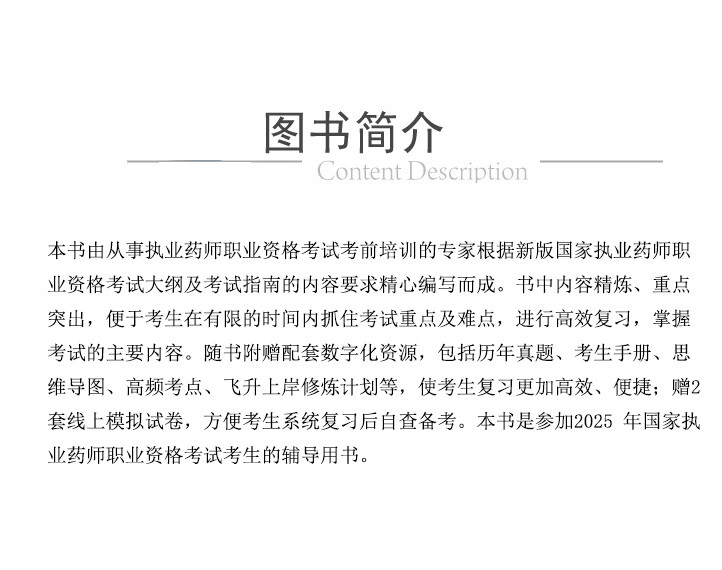 本书由从事执业药师职业资格考试考前培训的专家根据新版国家执业药师职业资格考试大纲及考试指南的内容要求精心编写而成。书中内容精炼、重点突出,便于考生在有限的时间内抓住考试重点及难点,进行高效复习,掌握考试的主要内容。随书附赠配套数字化资源,包括历年真题、考生手册、思维导图、高频考点、飞升上岸修炼计划等,使考生复习更加高效、便捷;赠2套线上模拟试卷,方便考生系统复习后自查备考。本书是参加2025年国家执业药师职业资格考试考生的辅导用书。
