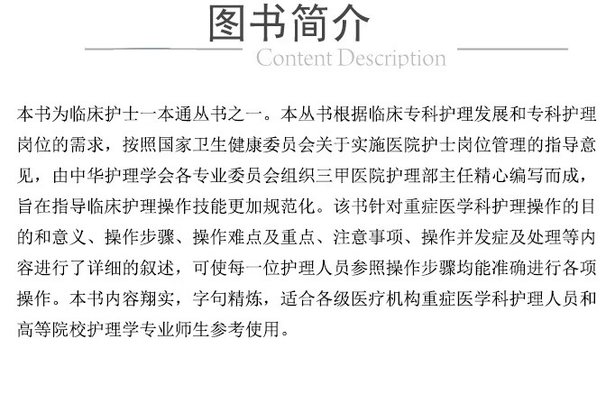 本书为临床护士一本通丛书之一。本丛书根据临床专科护理发展和专科护理岗位的需求,按照国家卫生健康委员会关于实施医院护士岗位管理的指导意见,由中华护理学会各专业委员会组织三甲医院护理部主任精心编写而成,旨在指导临床护理操作技能更加规范化。该书针对重症医学科护理操作的目的和意义、操作步骤、操作难点及重点、注意事项、操作并发症及处理等内容进行了详细的叙述,可使每一位护理人员参照操作步骤均能准确进行各项操作。本书内容翔实,字句精炼,适合各级医疗机构重症医学科护理人员和高等院校护理学专业师生参考使用。