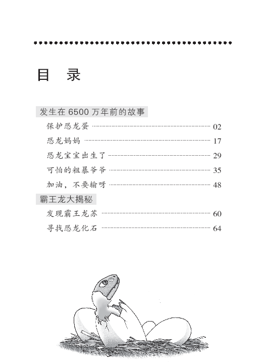 1、史前时代的霸王龙故事。书的前半部分是一个发生在中生代的恐龙故事,小不点和妈妈为了保护恐龙蛋,与其他恐龙斗智斗勇。这本书既能满足孩子的好奇与想象,也可以回答恐龙这个失落的世界的重要问题。