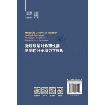 本书采用 MD 方法,探究微观缺陷对炸药性能影响情况,全书共分为 6 章:第 1 章介绍含能材料微观缺陷的基础知识,包括微观缺陷产生的原因、微观缺陷产生的机理、含能材料微观缺陷研究现状;第 2 章介绍分子动力学理论基础知识;第 3 章选取高能炸药 PETN、HMX 为研究对象,探究微观缺陷对单体炸药性能影响情况;第 4 章以 HMX 基 PBX、CL-20 基 PBX 与 B 炸药为研究对象,探究微观缺陷对混合炸药性能影响;第 5 章选取典型的 CL-20/DNB、CL-20/TNT、CL-20/NQ、CL-20/HMX 共晶炸药为研究对象,探究微观缺陷对 CL-20 共晶炸药性能影响情况;第 6 章选取 HMX/NTO、HMX/NQ 为研究对象,探究微观缺陷对 HMX 共晶炸药性能影响情况。