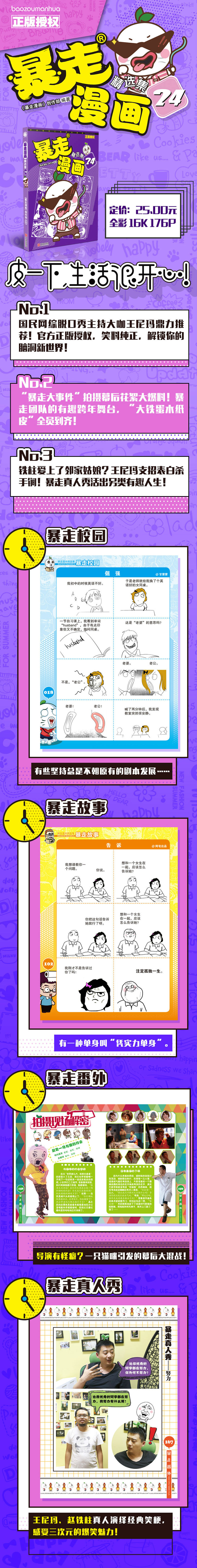 1.《暴走漫画》是近年备受追捧的网络漫画合集。全书分为暴走校园、暴走家庭、暴走故事、暴走番外四个板块。结个婚有多少关卡要过?天价彩礼难倒年轻小伙。游泳馆拖鞋你是不是经常都找不到?外卖小哥为了五星有多拼?赶紧翻开《暴走漫画精选集24》吧!
