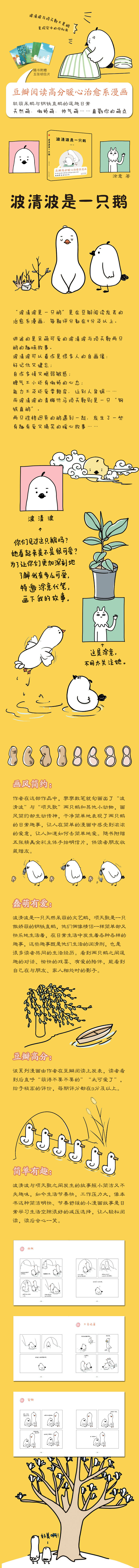 “波清波是一只鹅”是在豆瓣发表的治愈系漫画,每期评分都在9分及以上,讲述的是呆萌可爱的波清波与项天歌两只鹅的趣味故事。波清波可以看作是很多人的自画像:好记仇又健忘;自作多情又脆弱敏感;脾气不小还有傲娇的心态;能力不及还爱耍赖皮,让别人背锅……而波清波的青梅竹马项天歌则是一只“钢铁直鹅”。两只性格迥异的鹅遇到一起,发生了一些有趣有爱又搞笑的暖心故事……
