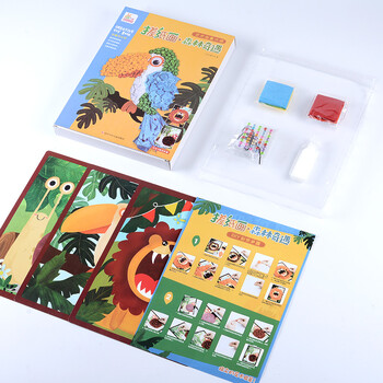 搓纸画森林奇遇:底板3张,彩色搓纸一套,纸绳1根,白胶1瓶,活动眼睛5个,宝石贴1张。