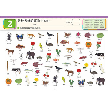 在每一页中,找到相同的物品并画上“O”。圈出所有物品后,本页练习完成。本书的主要使用目的是“找到相同的物品”,所以也可以在物品上画“x"或其他记号。