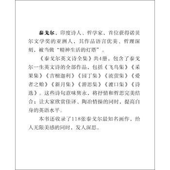 《泰戈尔英文诗全集(中英双语读本 套装1-4册)》还收录了118张泰戈尔知名画作,给人无限美感的同时,发人深思。