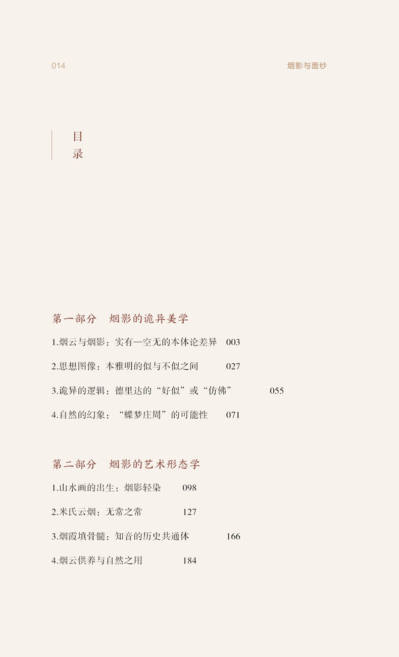 本书在“面纱”一词上阐释了中国传统绘画中烟、云、影等绘画表现的显现与遮掩的张力关系。从新石器时代的彩陶旋纹到商周的云雷纹,到绘画中的烟云景色,之间有着一种演变上的承继关系。在中国文化中,对于烟、云有着绝对的痴迷与思考,也是这本书的独特视角、敏锐的选题嗅觉,烟云的自然变化与想象力的是“似与不似之间”的形态美学最好的表现。