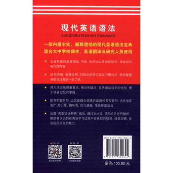 《现代英语语法》是一部内蕴丰实、阐释透彻的现代英语语法宝典,旨在以实际应用为目的,系统、全面地介绍英语的词法、句法、构词法以及语音规则。该书以系统、详尽、实用为显著特点。对语法知识的讲解全面系统,条理分明,重点突出;所选例句详实新颖,知识性和趣味性强;所设“典型错误解析”板块则有助于提高读者正确、灵活运用英语语言的能力。