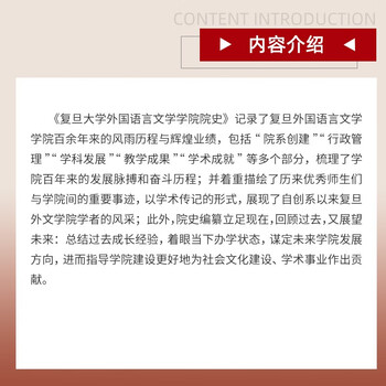 《复旦大学外国语言文学学院院史》记录了复旦外国语言文学学院百余年来的风雨历程与辉煌业绩,包括“院系创建”“行政管理”“学科发展”“教学成果”“学术成就”等多个部分,梳理了学院百年来的发展脉搏和奋斗历程;并着重描绘了历来优秀师生们与学院间的重要事迹,以学术传记的形式,展现了自创系以来复旦外文学院学者的风采;此外,院史编纂立足现在,回顾过去,又展望未来:总结过去成长经验,着眼当下办学状态,谋定未来学院发展方向,进而指导学院建设更好地为社会文化建设、学术事业作出贡献。