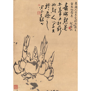三位老先生中,诸乐三先生的笔墨线条,属温柔敦厚的趣味,柔中见刚,浑厚古朴,行笔不迟不缓。吴茀之先生思维敏捷,秉性爽快而憨直,强调天趣的自然气势,行笔从吴昌硕的慢速度转变为快速度;笔线刚中见柔,极有韧性;笔墨变化非常丰富,又不失统一的原则,为一般人所不易做到。潘天寿先生除了他的线条以钢筋铁骨称誉以外,在用笔使转等方面,圆笔方笔参用,因而线条转折有力,变化多端,使人体味无穷。对于潘天寿先生画面上的一点一画,都可以显现他的惨淡经营与技巧的高度纯熟。他的指墨线条更有“折钗股”、“屋漏痕”的拗劲古拙之味,充分表达了大朴不雕这一方面的境界。正因为潘天寿先生的笔墨技巧从他的这一路讲已经达到了高难度的顶点,使后学者有望而生畏之感, 于今学之者寡,可说不无这个原因。