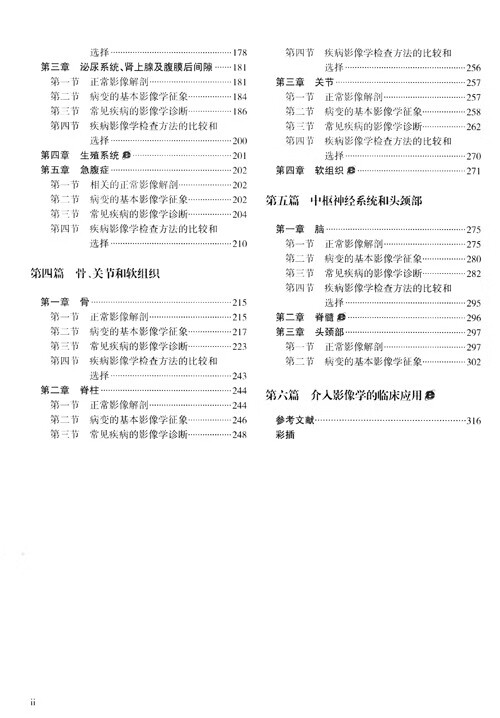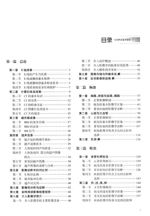 本教材共分6篇。在总论篇主要介绍了X线成像、计算机体层成像、磁共振成像、超声成像和介入影像学的基本概念和原理,介绍了影像诊断中的对比剂及其应用,并讨论了影像的分析与诊断的思维方法和阅读影像学诊断报告的基本原则和步骤。在胸部、腹部、骨、关节和软组织、中枢神经系统和头颈部等4篇中,按系统分为若干章,主要是根据X线征象将疾病分类讲述,将X线、CT、MR和超声的内容完全融合在一起。在介入影像学篇中主要介绍介入影像学的方法在各系统疾病诊治中的应用。