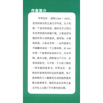 毕翠克丝波特(1866-1943),是英国著名的儿童文学作家,生于伦敦一个富有的家庭。她的名字之所以在世界范围内家喻户晓,主要是因为她创作的小动物童话,彼得兔、小猪鲁滨逊、小兔本杰明……这些故事几乎被翻译成每一个主要语种,从1902年第一个故事的发表到今天,年年印刷,版本无数,销售量以千万计。在英语国家里,几乎每一个小孩子都有一两本她的故事书。毕翠克丝波特创作故事的同时也创作插图,每个故事都有几十幅精美生动的插图紧密配合故事情节。她的作品在世界儿童文学史上占据了不可替代的位置。