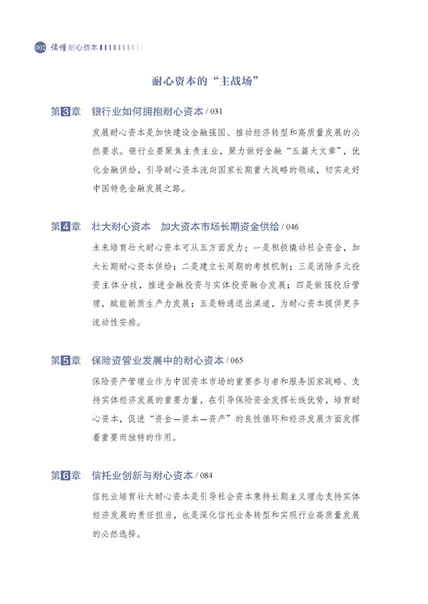 党的二十届三中全会明确提出要发展耐心资本,这将有助于进一步改善我国金融结构,为经济高质量发展提供长期、可持续的金融 “血液”。把耐心资本作为金融强国建设的 “抓手” 之一,重点在于全面优化中长期金融资源的有效供给,更好地服务以高科技、高效能、高质量为特征,新产业、新模式、新动能为核心要素的新质生产力发展。在短期主义甚嚣尘上的金融浪潮中,《读懂耐心资本》以深邃的洞察和扎实的实践,为读者打开了一扇理解长期价值的新视窗。本书从耐心资本与高质量发展的相关理论探讨出发,创新性地把中国特色金融文化作为耐心资本的 “加持” 力量。同时,基于银行业、资本市场、保险资管、信托业等典型金融领域,深入分析了耐心资本的多重供给路径。并且围绕耐心资本如何助力科技金融、绿色金融、普惠金融、养老金融、数字金融这五篇大文章,进行了系统研究。