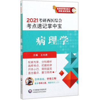 《病理学/2021考研西医综合考点速记掌中宝》是“2021考研西医综合考点速记掌中宝”丛书之一。包括“高分考点速记”和“历年考点必背”两部分内容,“高分考点速记”以表格形式一目了然地呈现新考试大纲的高频重点和易错难点;“历年考点必背”按照“一对一”“易混淆”“一对多”三种形式归纳历年考点,帮助考生快速掌握历年题库。《病理学/2021考研西医综合考点速记掌中宝》开本小巧精致,方便携带,使考生随时随地皆可链接考试内容,是参加2021年考研西医综合考试考生的制胜备考口袋书。