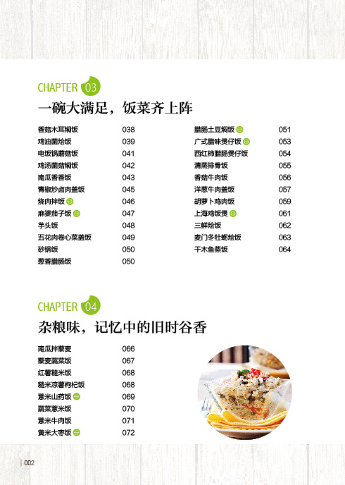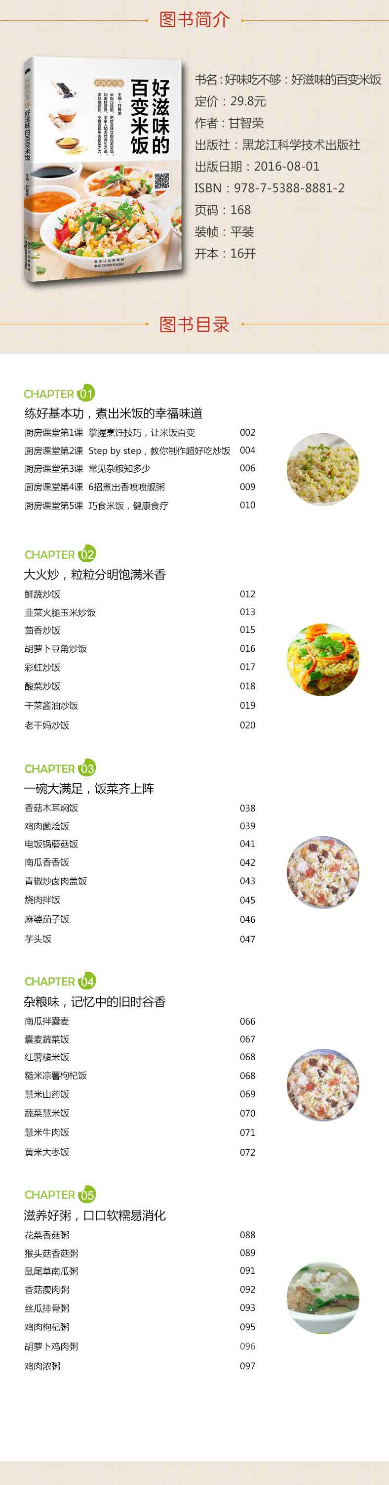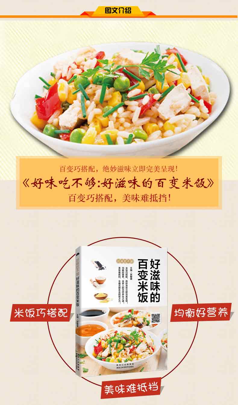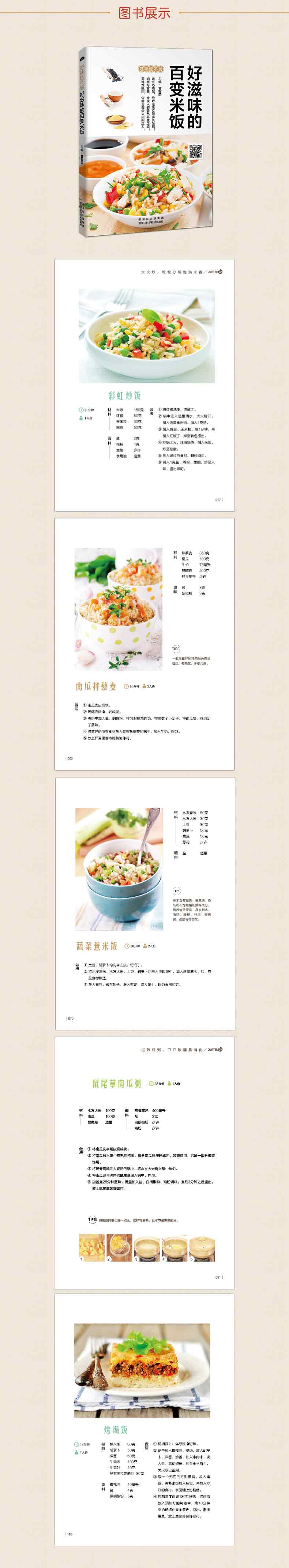 米饭是餐桌上的常客,如何让米饭压过菜肴的风头,本书告诉你。书中囊括喷香炒饭、饱足盖饭、营养杂粮饭、滋补好粥,风味多变,美味十足。有了这本书,可以轻松令米饭变成餐桌上的主角。