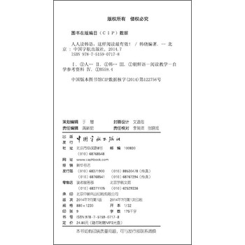 《人人读韩语,这样阅读最有效!(随书赠光盘)》中的歌谣、影视部分截取原声MP3,其他部分的音频文件由来自韩国首尔的男女外教精心录制,语音纯正优美,宜跟读、宜欣赏,可以感受到至真至美的韩语魅力!
