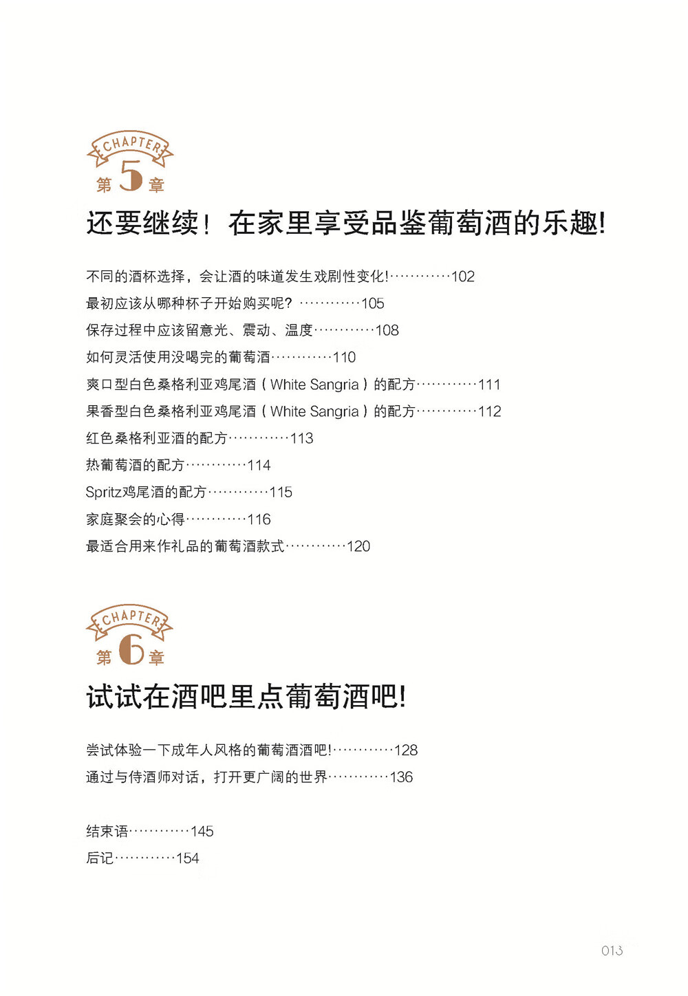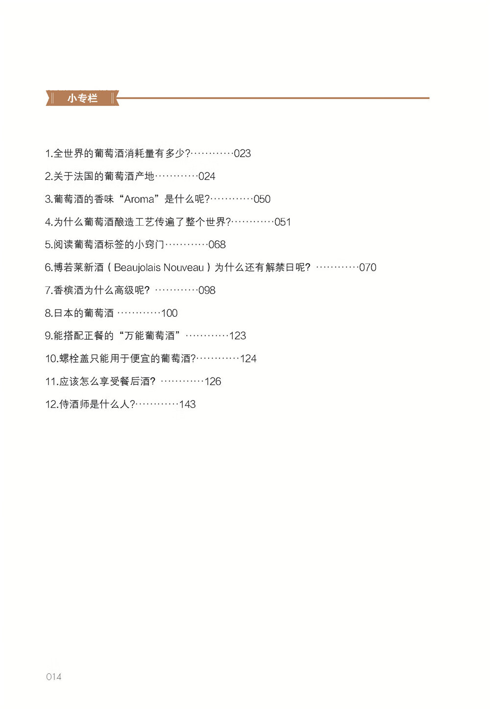 小石女士刚开始选择红酒的时候“主要以智利产葡萄酒”为主,后来熟悉了独具特色的白、红葡萄酒种类,接下来了解了旧世界与新世界的区别,而且视野扩展到了桃红葡萄酒和发泡酒的领域。其实在这个过程中,我们并没有努力背诵什么暗号,而是在每次边品鉴葡萄酒边乐享美食的过程中学习而已。所以,希望阅读本书的读者也能亲身体验一下,享受一下这美好的过程。