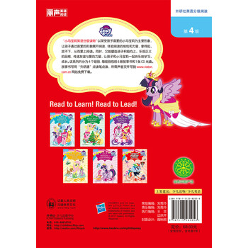 “小马宝莉英语分级读物”分级科学严谨,在词汇量、视觉词、句长等方面都有严格控制。在故事内容上,能够帮助孩子培养独立思考、解决问题的能力。“小马宝莉英语分级读物”系列共分为四个级别,适合小学中低年级的孩子阅读。