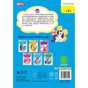 “小马宝莉英语分级读物”以深受孩子喜爱的小马宝莉为主要形象,让孩子通过喜爱的形象展开双语阅读,体验阅读的愉悦和力量,拿得起、放不下,从而爱上阅读。同时,“小马宝莉英语分级读物”还能塑造孩子积极向上、乐观正义的品格,传递友谊与爱的力量,让孩子和小马宝莉一起快乐地学习、成长。“小马宝莉英语分级读物”系列共分4个级别,每级别包括6册故事书和1张CD光盘。故事书可用“外研通”点读笔点读,所需声音文件需到外研通网站免费下载。